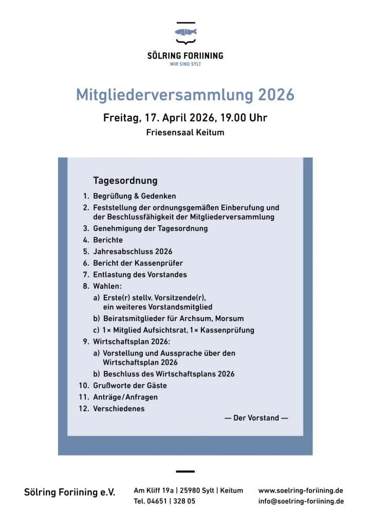 Vereine haben es schwer. Es fehlt oft an Nachwuchs, an Engagement und Relevanz ihrer selbstgesteckten Aufgaben und Ziele. Beim Sylter Heimatverein, der Sölring Foriining, mit rund 2.000 Mitgliedern der größte Heimatverein des Landes, scheint aber all das nicht zuzutreffen. Zwar lag der Altersdurchschnitt der Mitglieder, die sich am vergangenen Freitag im Keitumer Friesensaal zur Jahreshauptversammlung eingefunden hatten, gefühlt bei Ü50, aber die Frische, Kurzweil und ausgesprochen positive Grundstimmung, mit der der Vorstand und die Geschäftsführung der Foriining durch die Tagesordnung führten, war sicher einer der Gründe, weshalb der Bürgervorsteher der Gemeinde Sylt, Andreas Dobrzinski, sein von spürbarer Begeisterung für die Foriining vorgetragenes Grußwort der Gemeinde mit dem Satz schloss: „Ihr seid ein lebendiger Verein!“